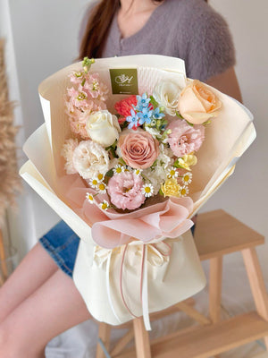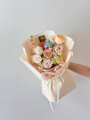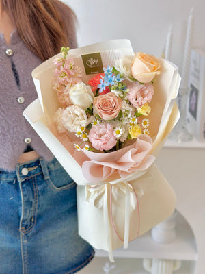 Fresh Flower: 1 x Cappuccino Rose, 1 x Champagne Rose, 1 x White Rose, Oxypetalum Blue, Pink Eustoma, White Eustoma, Orange Carnation, 2 x Matthiola, Chamomile, Yellow Carnation spray