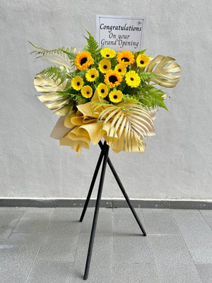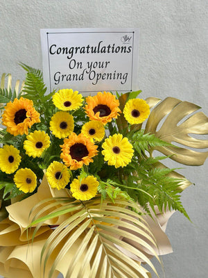 Fresh Flower: Yellow Gerbera, Sunflower, Large Tinted Gold Monstera Leaves, Tinted Gold Palm Leaf, Paku Leaf