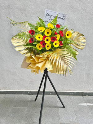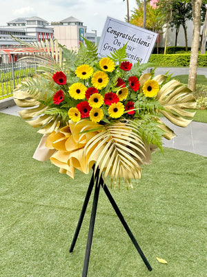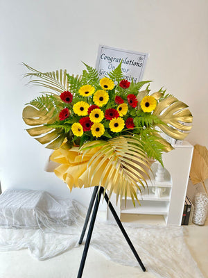 Fresh Flower: 9-10 x Yellow Gerbera, 8 -9 x Red Gerbera, Large Tinted Gold Monstera Leaves, Tinted Gold Palm Leaf, Paku Leaf