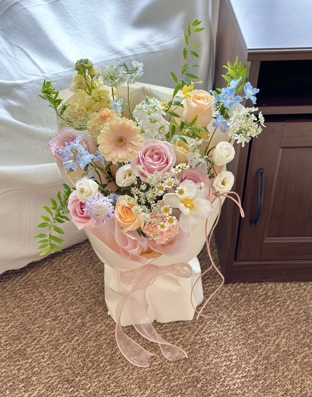 Fresh Flower: 2 x litchi pink rose, 1 x champagne imported gerbera, 1 x white tulips , 2 x pink rose, 2 x buttercup rose,1 x purple scabiosa, 2 x orange champagne rose, 1 x Ammi majus, chamomile, 1 x ammi new ,white eustoma, 1 x novia carnation, 1 x panicum, 2 x delphinium blue, 2 x snow willow leaf, 1 x white matthiola