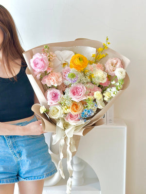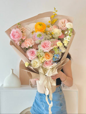 Place your flower bouquet in a cool room or shaded area. Please avoid placing your bouquet in a fridge / exposing your bouquet to direct extreme heat, ripening fruits, and direct sunlight.