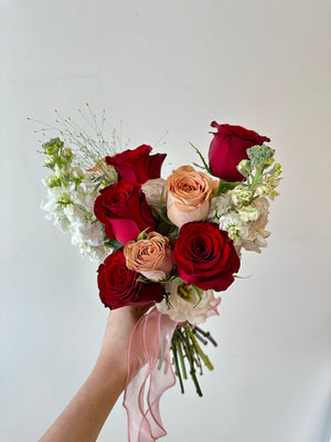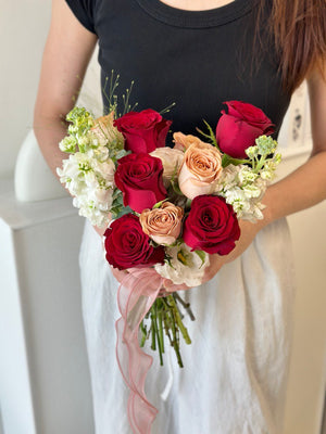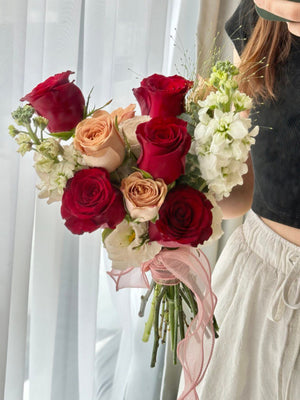Fresh Flower: 5 - 6 Red Rose, 4 - 5 Cappuccino Rose, 2 x Matthiola, 1 x Panicum, Eustoma