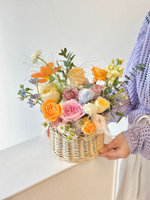 Fresh Flower: 1 x Orange tulip, 2 x Buttercup rose, 1 x Pink and white scabiosa, 2 x orange rose spray butterfly, parvifolia eucalyptus, 1x hana white, 2 x oxypetalum blue, 1 x purple scabiosa, 1 Litchi pink rose , 1 x Champage rose ,1 x Panicum , 2 x White tracymene , 1 x White eustoma , 1 x Yellow mathiola