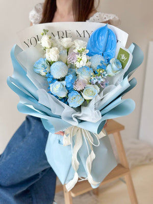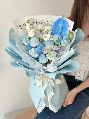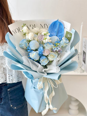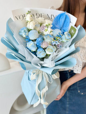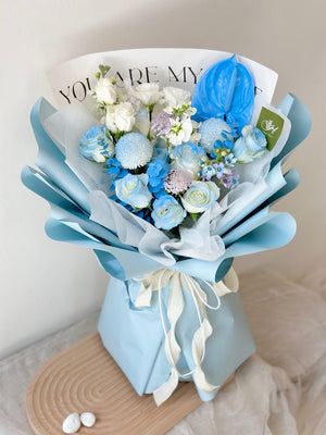 Fresh Flower: 8 - 9 White Rose, Matthila, Eustoma, Ping Pong, Anthurium, Oxypetalum Blue, Trachymene, Eucalyptus