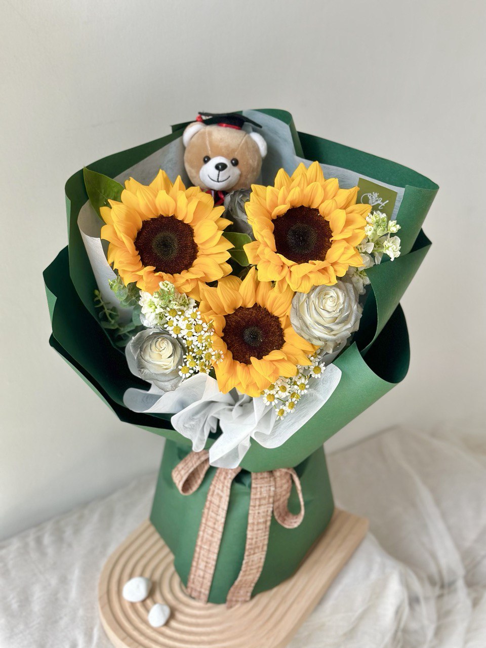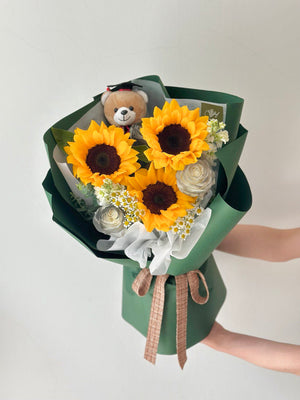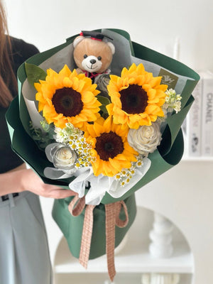 Fresh Flower: 3 x Sunflower, 3 x White Rose, 2 x Matthiola, Chamomile, Eucalyptus