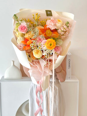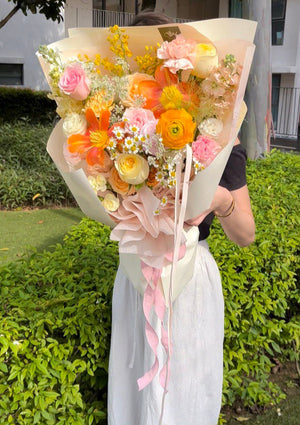 Place your flower bouquet in a cool room or shaded area. Please avoid placing your bouquet in a fridge / exposing your bouquet to direct extreme heat, ripening fruits, and direct sunlight.