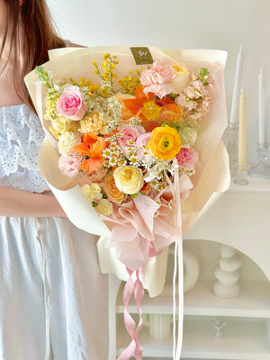 Fresh Flower: 2 x Orange Tulip, 3 x Pink Rose, 2 x Champagne Rose, 2 x Buttercup Rose, 1 x Ranunculus, 3 x Matthiola, 1 x Ammi Majus, Dancing Lady, 3 x Carnation, 1 x Panicum, Eustoma, Carnation Spray, Chamomile
