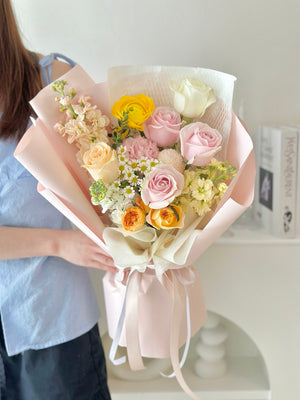 Fresh Flower: 3 x Pink Rose, 1 x Champagne Rose, 1 x White Rose, 3 x Matthiola, Eustoma, Ping Pong, Ranunculus, Rose spray butterfly orange