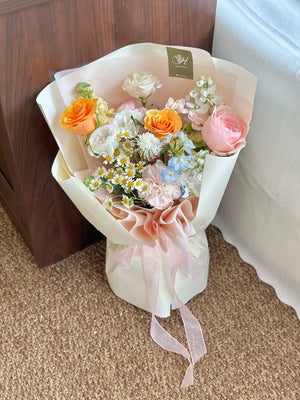 Place your flower bouquet in a cool room or shaded area. Please avoid placing your bouquet in a fridge / exposing your bouquet to direct extreme heat, ripening fruits, and direct sunlight.