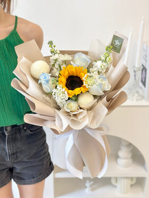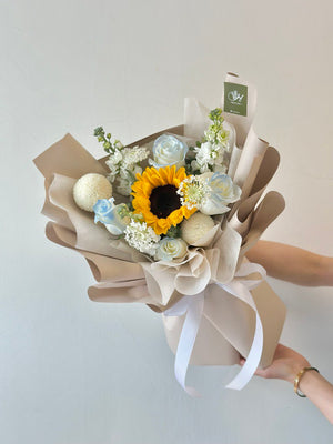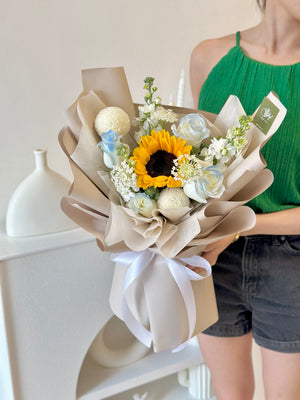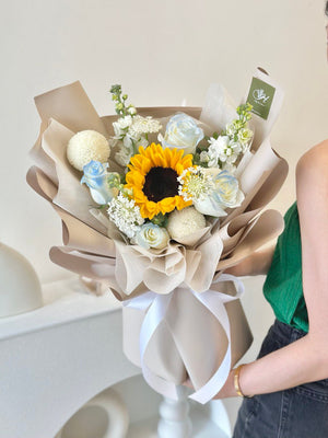 Fresh Flower: 1 x Sunflower, 4 x White Rose, 3 x Trachymene, 3 x Matthiola, 2 x Ping Pong, Eucalyptus Leaf