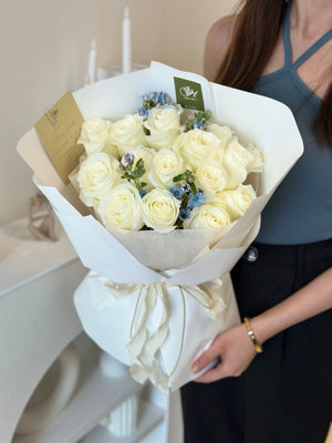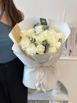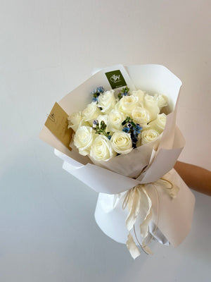 Fresh Flower: 15 x White Rose, 4 x Oxypetalum Blue
