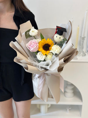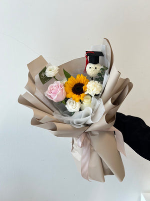 Fresh Flower: Sunflower, 1 x Pink Rose, 1 x White Rose, 1 x White Carnation , Ping Pong with graduation hat, Eustoma, Eucalyptus Leaf