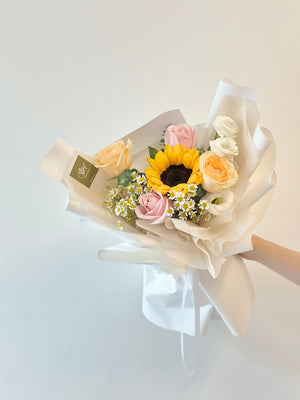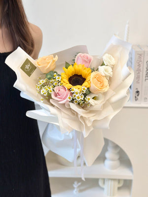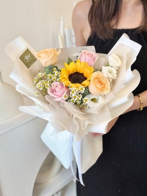 Fresh Flower: 1 x Sunflower, 2 x Pink Rose, 2 x Champagne Rose, Eustoma, Chamomile
